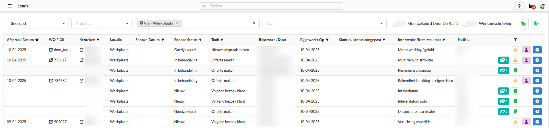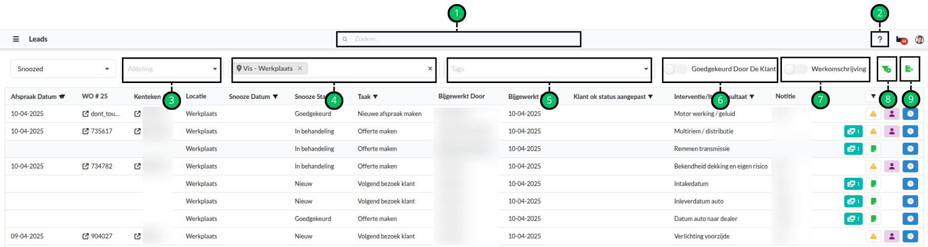 Kenteken | Het kenteken van het gesnoozede item. Als hier niks is ingevuld hoort dit gesnoozede item bij de werkorder die erboven staat. Klik hierop om te filteren op lease of geen lease.* |