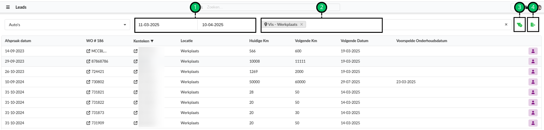 Kenteken | Het kenteken van het item. Als hier niks is ingevuld hoort dit item bij de werkorder die erboven staat. Klik hierop om te filteren op lease of geen lease.* |