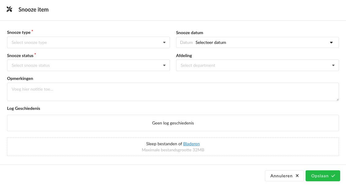Snooze status | Filter op de ingevulde snooze status van gesnoozede items, zoals: nieuw, in behandeling, goedgekeurd enz. |