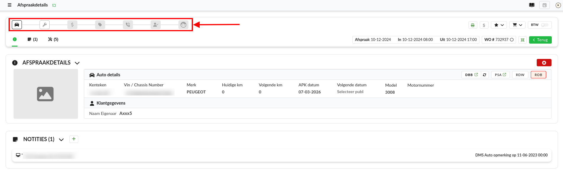 Uitzondering is de Auto in werkplaats knop, die is tijdens het hele proces klikbaar zodat je aan kan geven dat de auto wel of niet in de werkplaats is.