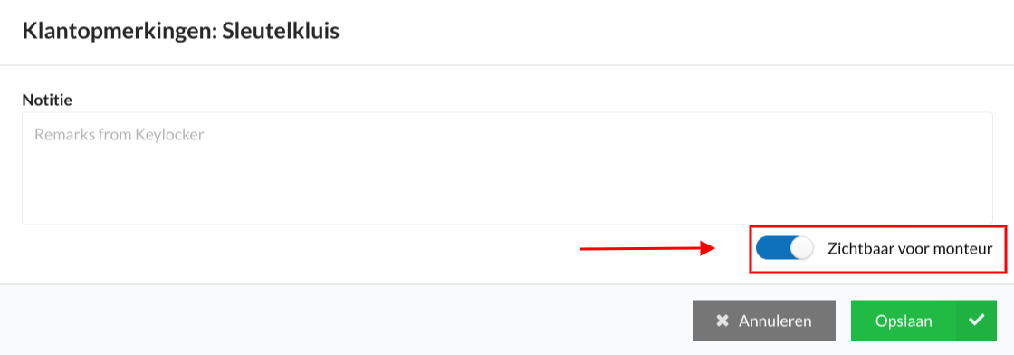 De volgende modal wordt geopend. Schakel de knop Zichtbaar voor monteur in: