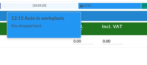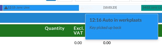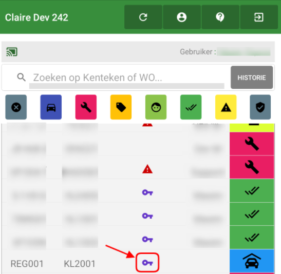 Zodra de klant zijn sleutels achterlaat, verschijnt er een sleutelicoontje op de WO op de afsprakenlijst pagina. De werkorder komt dan bovenaan de lijst te staan. De kleur van het veld voor chauffeur/eigenaar/aannemer moet nu blauw zijn, ongeacht of een online check-in eerder is beantwoord.