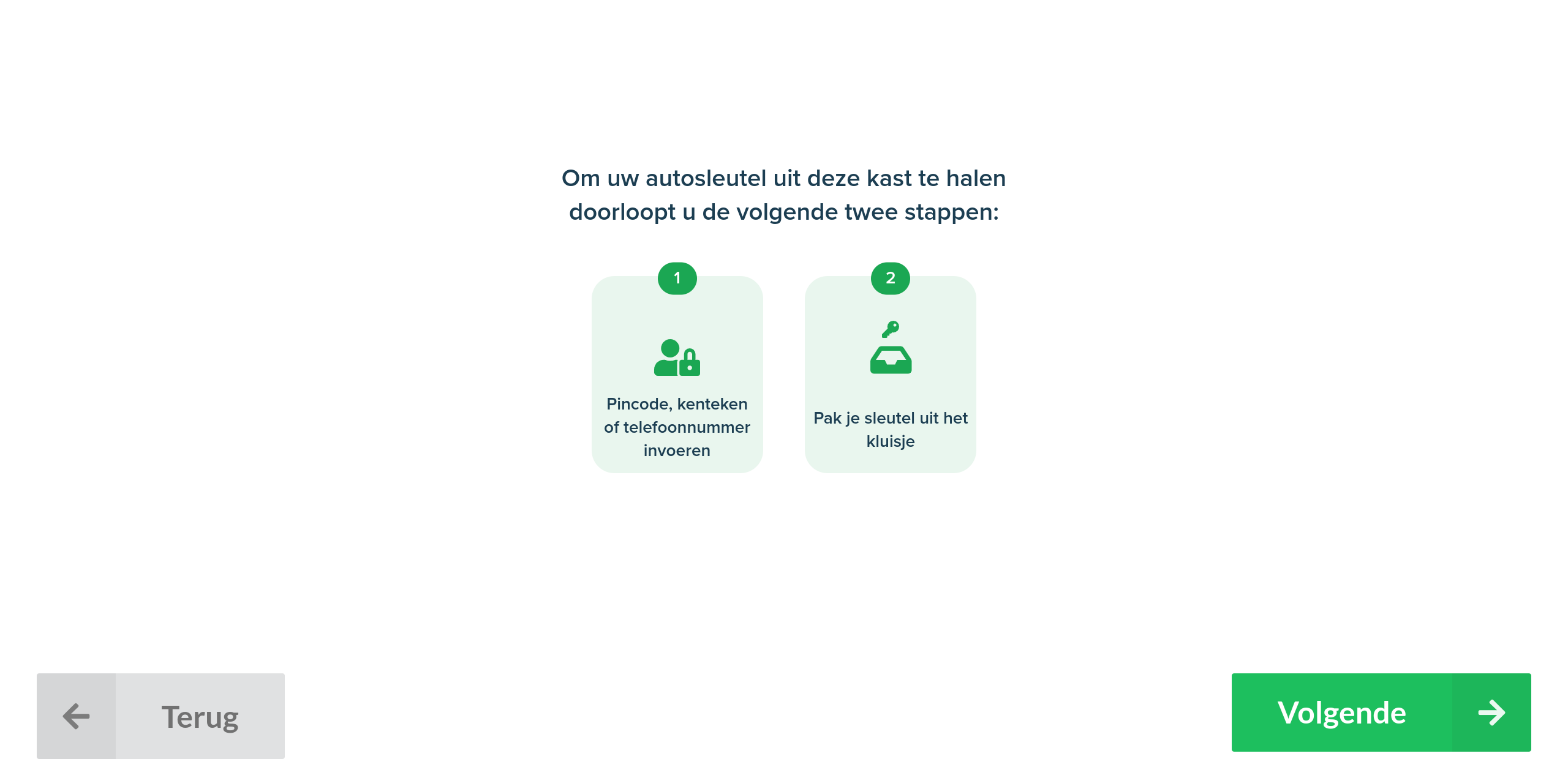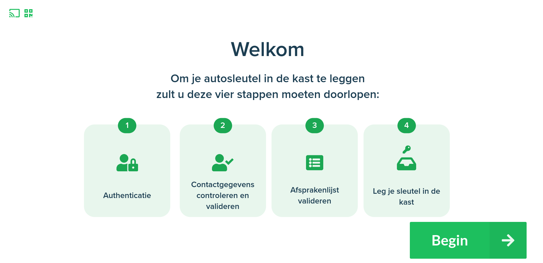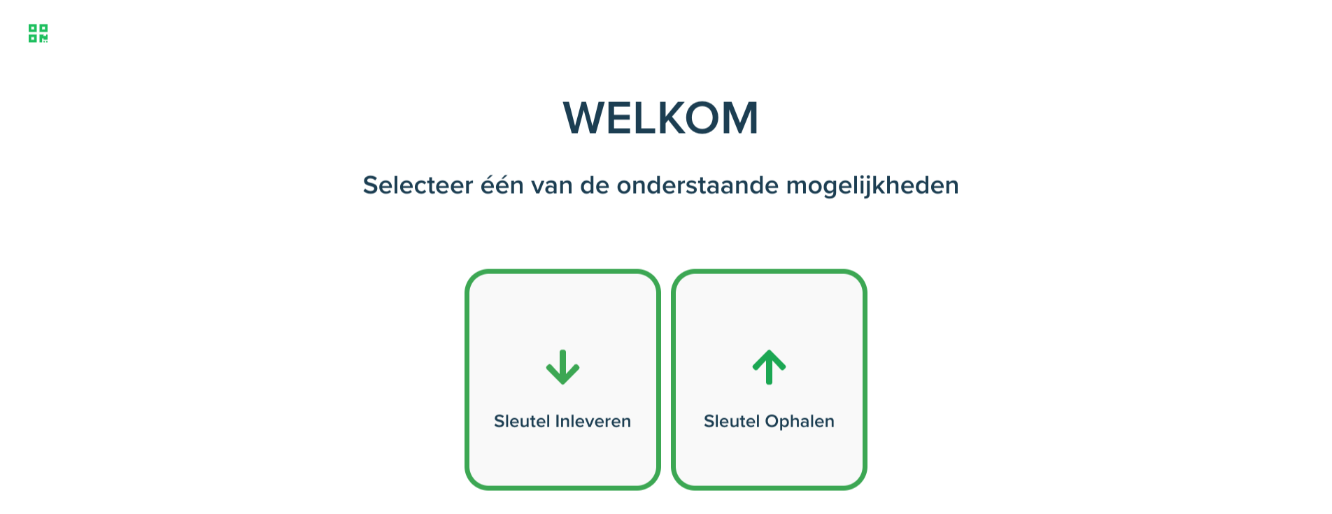 Het welkomstscherm informeert de gebruiker duidelijk over de stappen die hij moet volgen om zijn/haar sleutels succesvol af te geven.