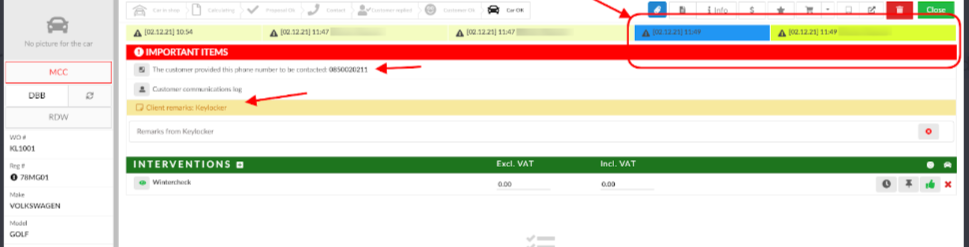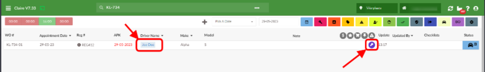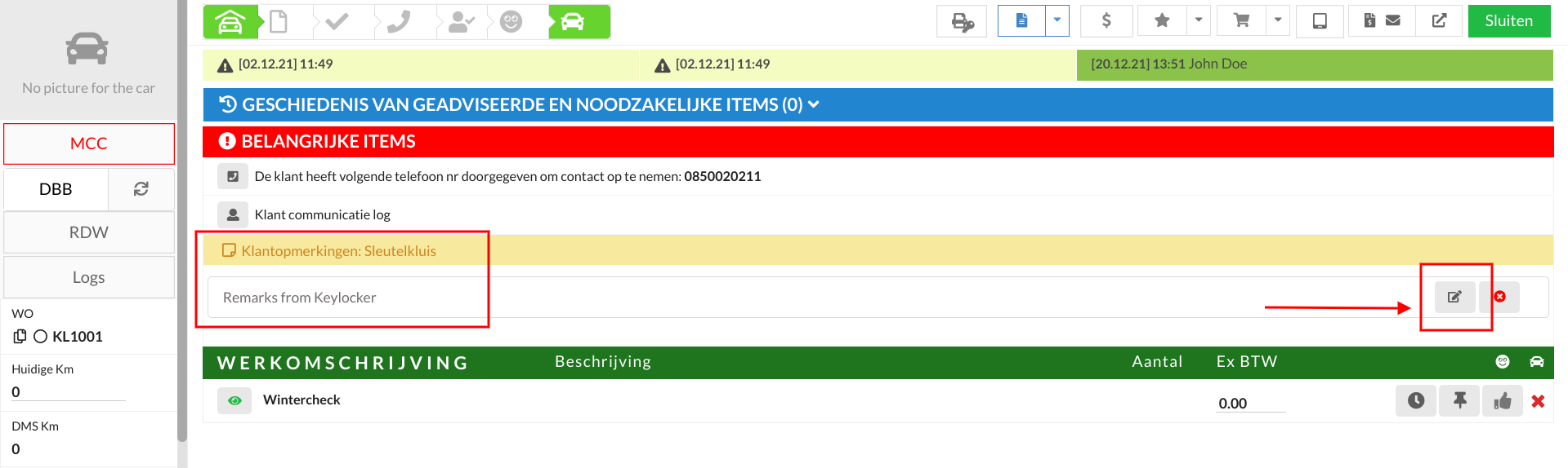 Op de afsprakenpagina geeft de tijdlijn aan dat de auto in de werkplaats staat en dat de sleutel is achtergelaten en de sleutel is opgehaald. U kunt ook een nieuw telefoonnummer of opmerking zien die door de klant is toegevoegd.