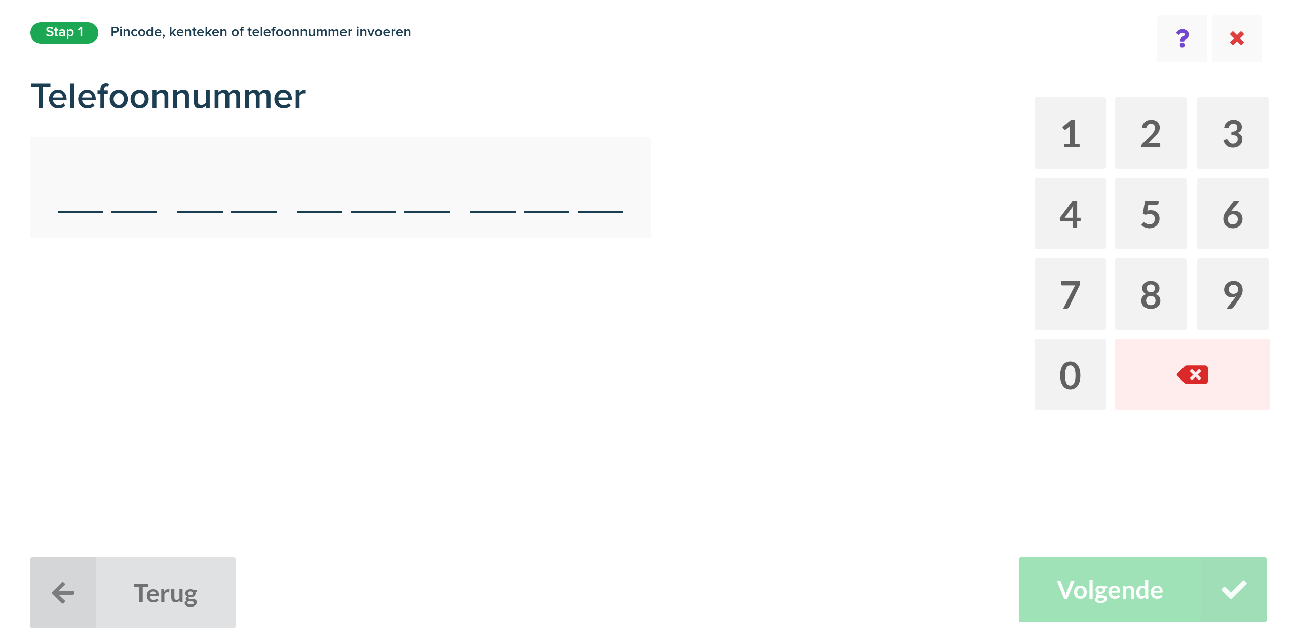 Klanten kunnen het proces op elk moment afbreken door op het rode kruisje rechtsboven te klikken. Hierna zal de gebruiker een nieuw scherm te zien krijgen waar hij/zij het afbreken kan bevestigen.