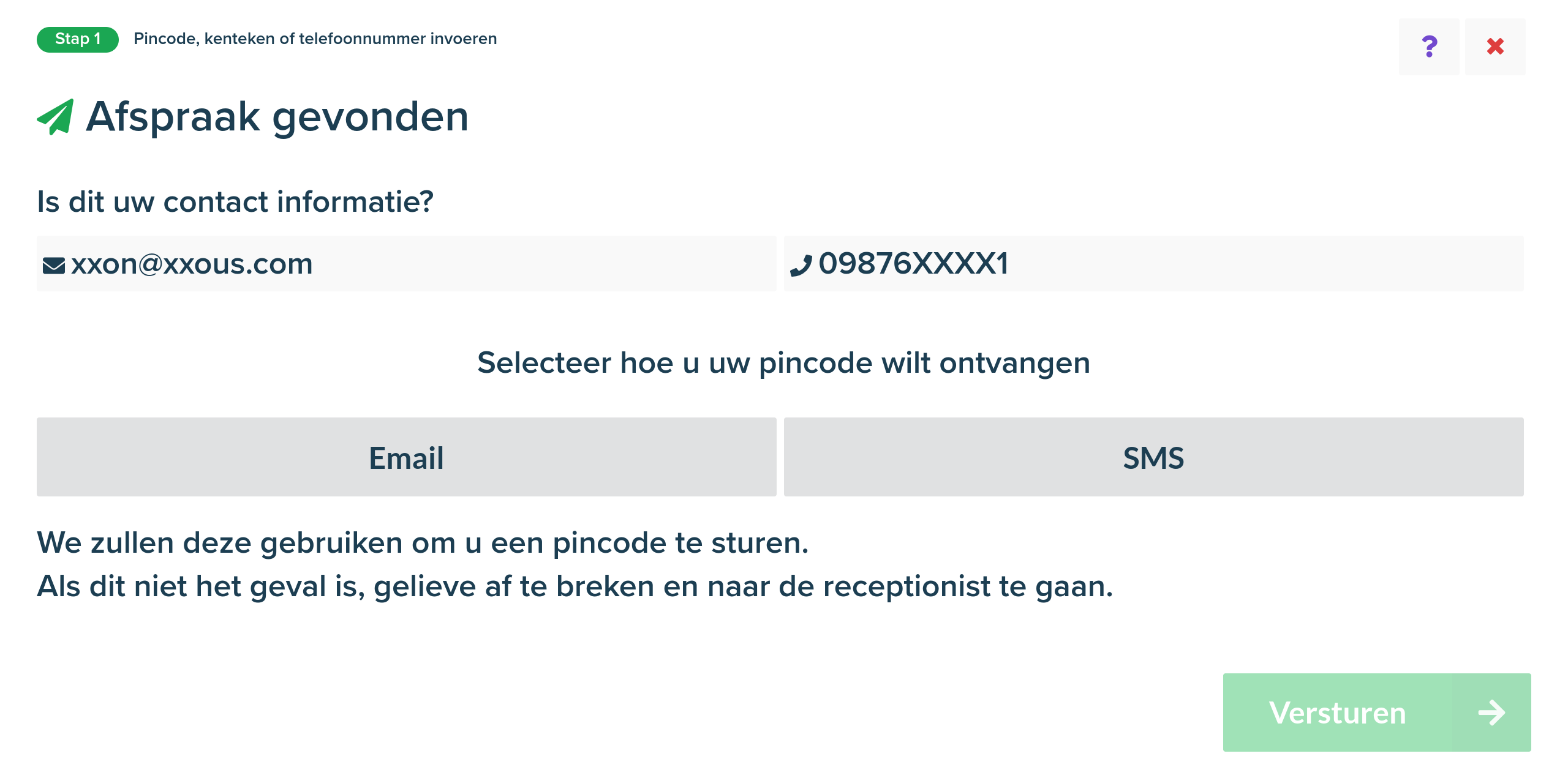Als het telefoonnummer overeenkomt met het mobiele telefoonnummer van de berijder (privé of zakelijk), een WO met de afspraak datum van vandaag en de klant heeft een privé of zakelijk e-mailadres, dan verschijnt het volgende scherm.