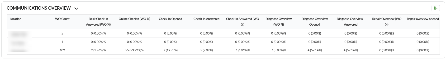 Location: amount of pins generated from check-in and the percentage out of WO Count.