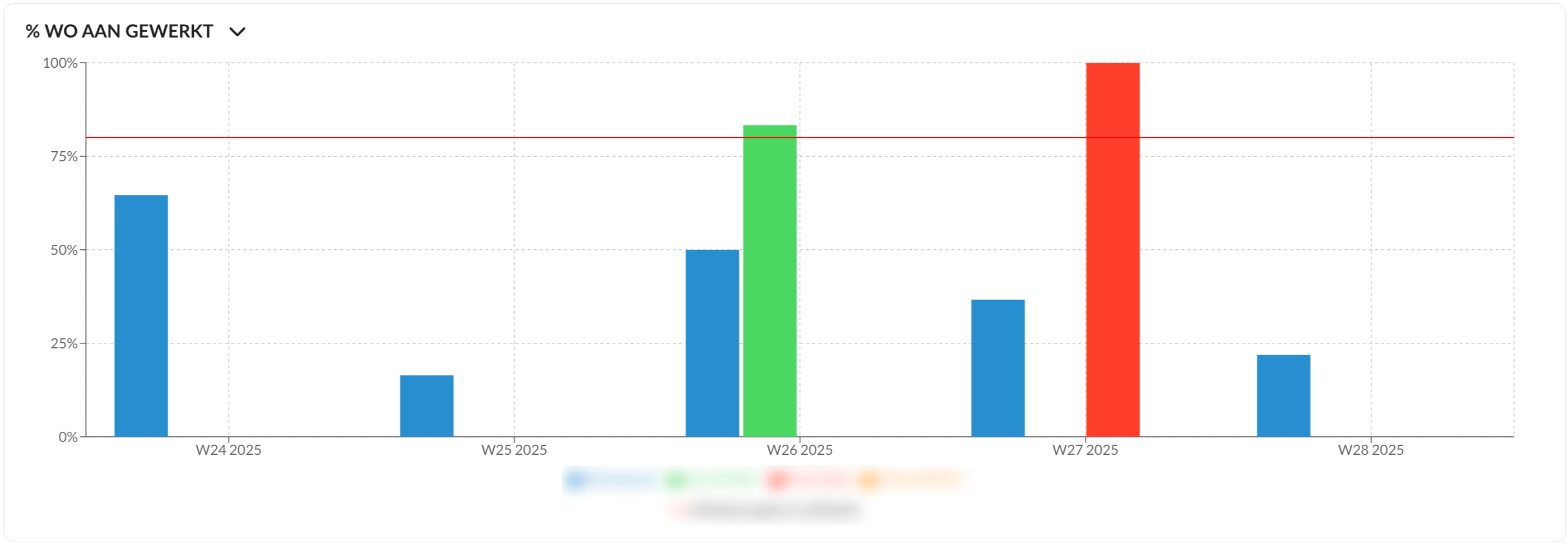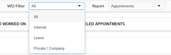 Standaard tonen de grafieken alle WO-types (Alle). Door op de dropdown WO filter te klikken, kun jij kiezen tussen verschillende typen WO: Alle, Intern, Lease of Particulier/Bedrijf (alles behalve Intern/Lease).