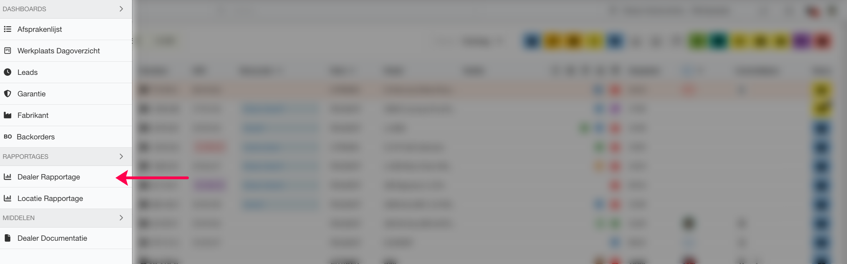 Klik in het hamburgermenu op Dealer Rapportage.