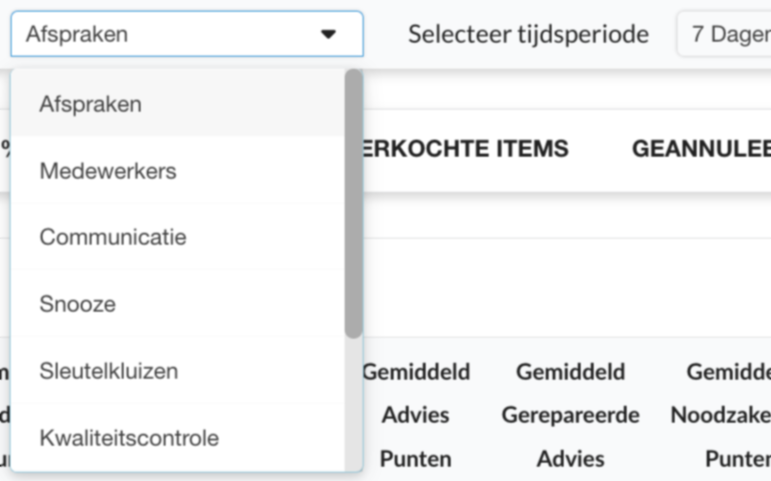 Standaard worden de grafieken getoond die afspraken betreffen. Je kunt kiezen uit verschillende rapporten in de dropdown Rapporten: Afspraken, Medewerkers, Communicatie (indien de Klantcommunicatie module is geactiveerd), Snooze, Sleutelkluizen, Kwaliteitscontrole, Banden en Kiosk.