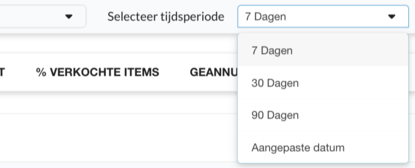 Standaard beslaan de grafieken de afgelopen 7 dagen. Jij kunt kiezen tussen de laatste 7, 30, 90 dagen of een aangepaste periode door de dropdown in de rechterbovenhoek te openen.