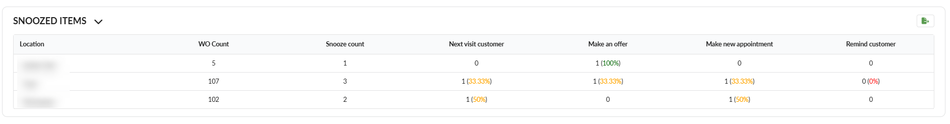 Remind Customer: Count of snooze with the type Remind Customer selected and his percentage out of the total count of snooze.