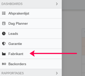 Het fabrikant dashboard is standaard de landingspagina voor de rol Fabrikant. Daarnaast kun je de pagina met een andere rol vinden in het linkermenu.