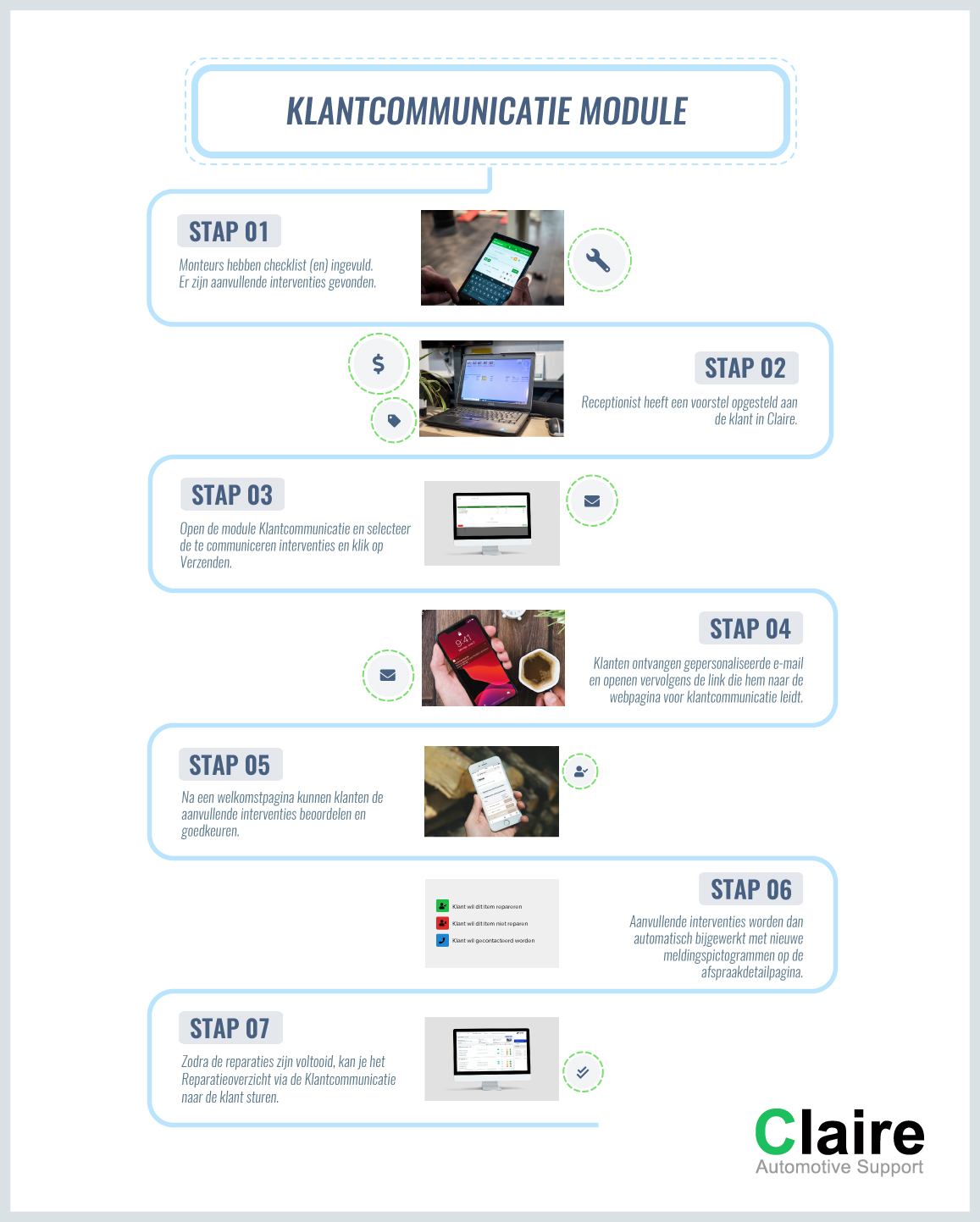 De Klantcommunicatie module is volledig in overeenstemming met het Claire-proces gebouwd om vertragingen op uw werkplek te verminderen.
