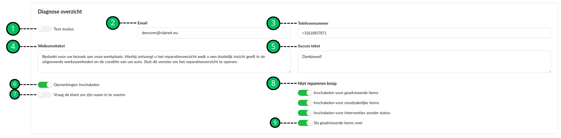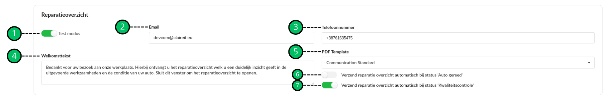 Telefoonnummer waarnaar het reparatieoverzicht wordt verstuurd, indien test modus ingeschakeld. |