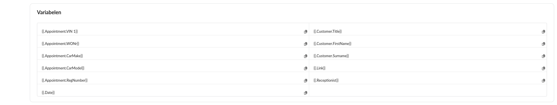 Lijst van plaatshouders die ingevuld kunnen worden in de welkomsttekst en succestekst van de klantcommunicatie. Deze worden automatisch ingevuld op basis van de informatie die in de werkorder staat, zoals bijvoorbeeld de klantnaam of het merk/model van de auto.