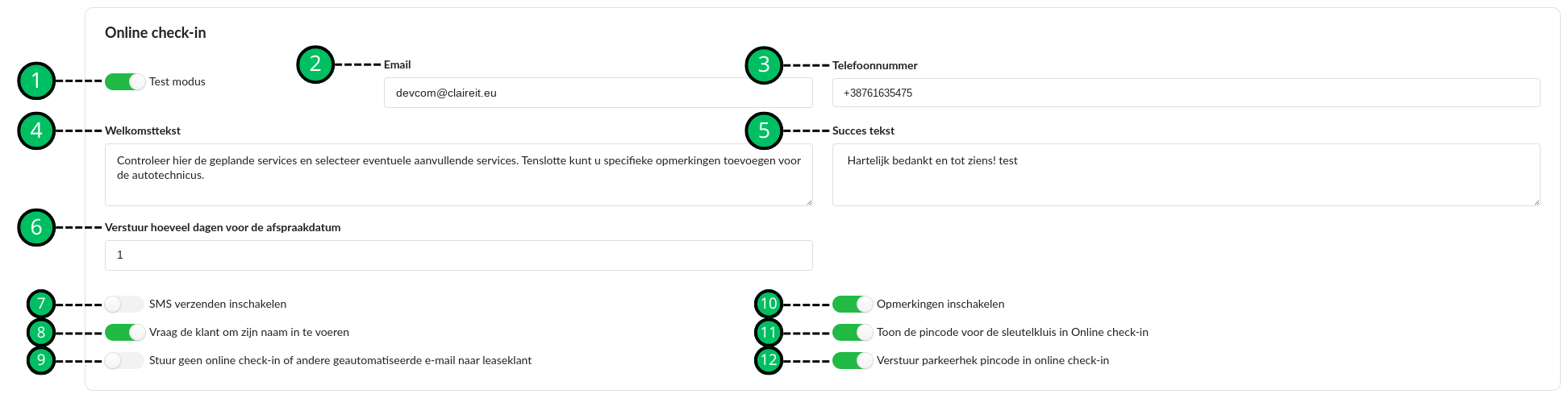 Door de schuifknop in te schakelen worden alle online check-in naar het ingevoerde emailadres of telefoonnummer gestuurd. |