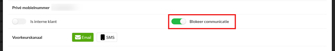 Als jouw locatie ervoor heeft gekozen om onze Klantcommunicatie module te gebruiken, kun je klanten uitsluiten van het ontvangen van e-mail- en sms-berichten. Schakel hiervoor de knop Communicatie blokkeren in, zoals aangegeven in de afbeelding hieronder.