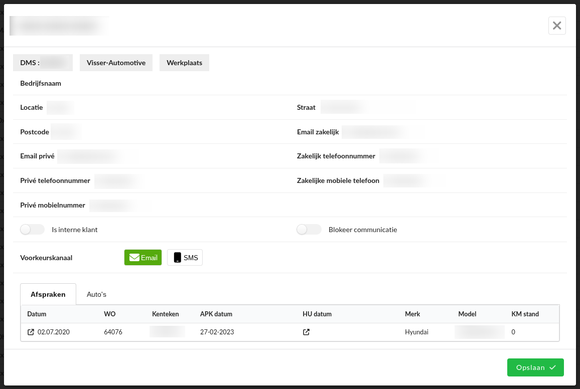 Onderaan kun je de Afspraken en Auto's zien die zijn gerelateerd aan deze klant.