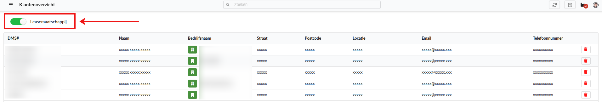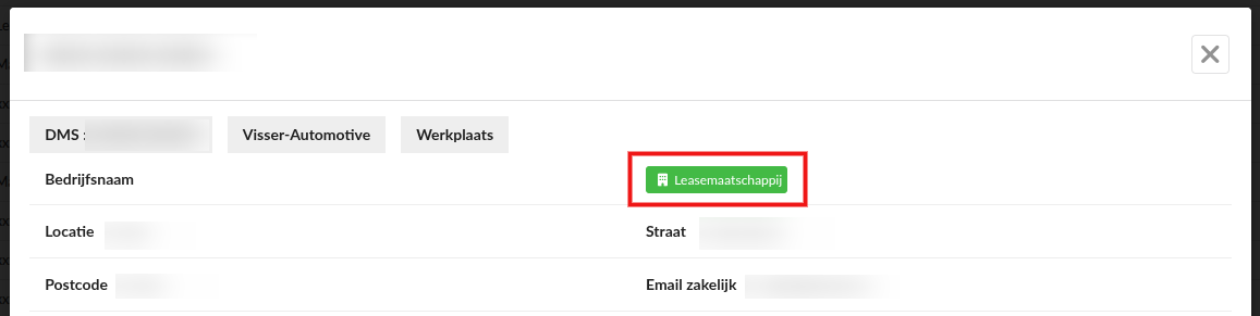 Een leasemaatschappij kun je herkennen aan het groene icoon in de kolom Bedrijfsnaam.