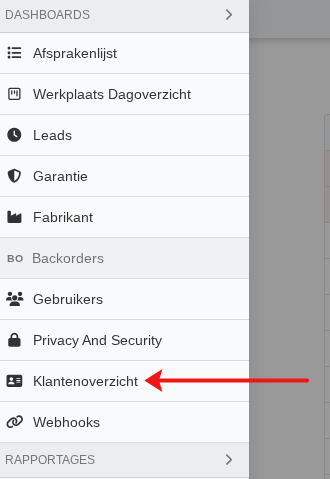 Het klantenoverzicht is beschikbaar in het hemburger menu