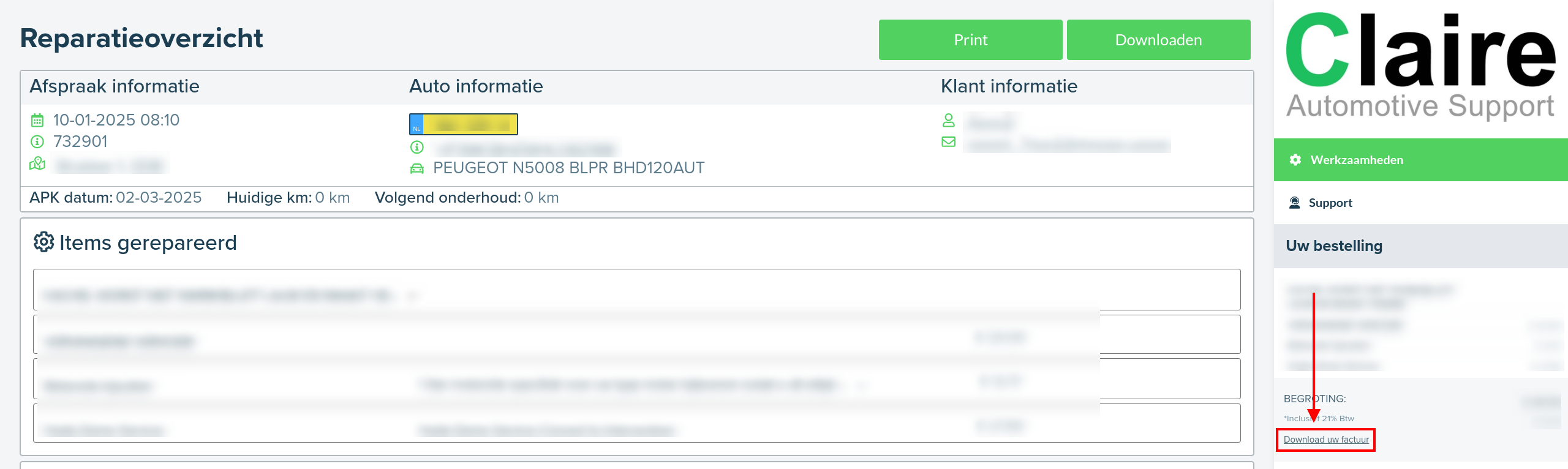 Wanneer de klant het reparatieoverzicht opent heeft hij/zij de optie om de klantrekening te downloaden door op Download uw factuur te klikken.