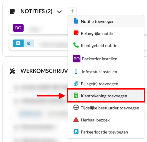 In de werkorder pagina klik je in het vak Notities op het groene plus icoon. Hier kun je de Klantrekening toevoegen.