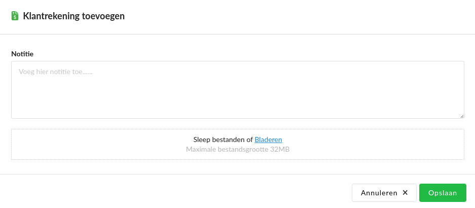 Door op klantrekening toevoegen te klikken opent een pop-up waar je een bestand toevoegt door deze ernaartoe te slepen of op bladeren te klikken. Je kunt hier ook een notitie toevoegen.