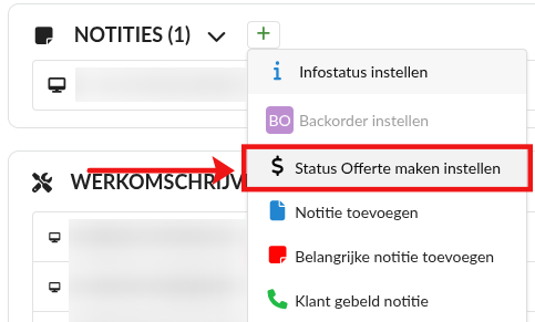 het groene plus icoon. Hier staat Status Offerte maken instellen.
