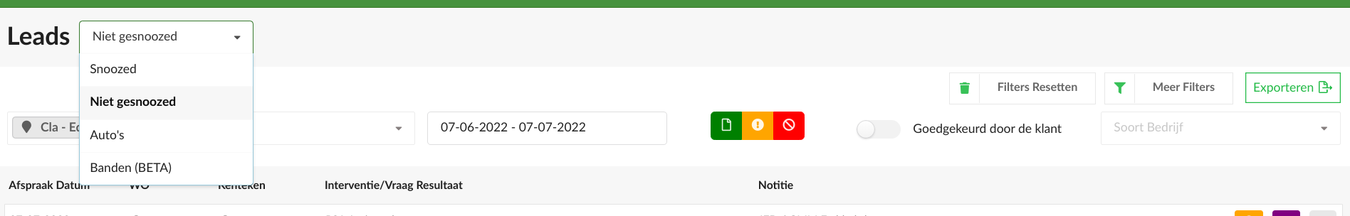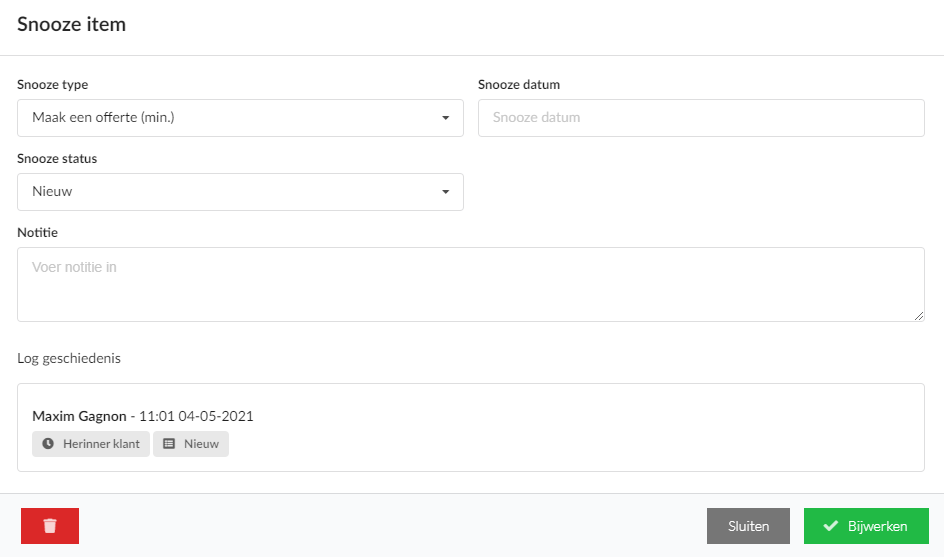 Een belangrijke notitie bij de snooze types: Wanneer je het type 'herinner klant' aanklikt, verstuurt deze geen mail naar de klant, maar is bij te houden in het leads dashboard.