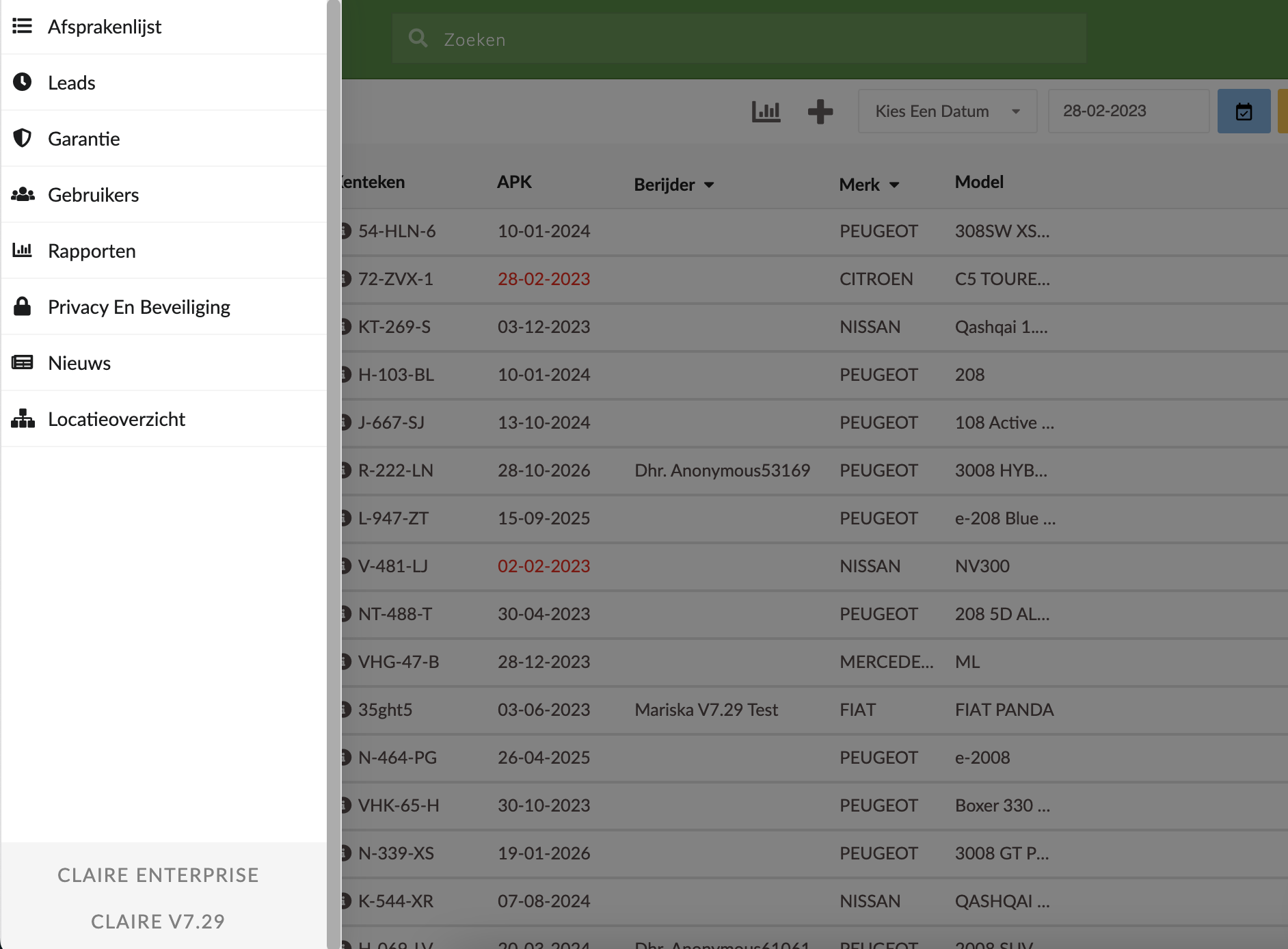 Wanneer je als receptionist op de snoozed items knop klikt, krijg je het volgende overzicht te zien.