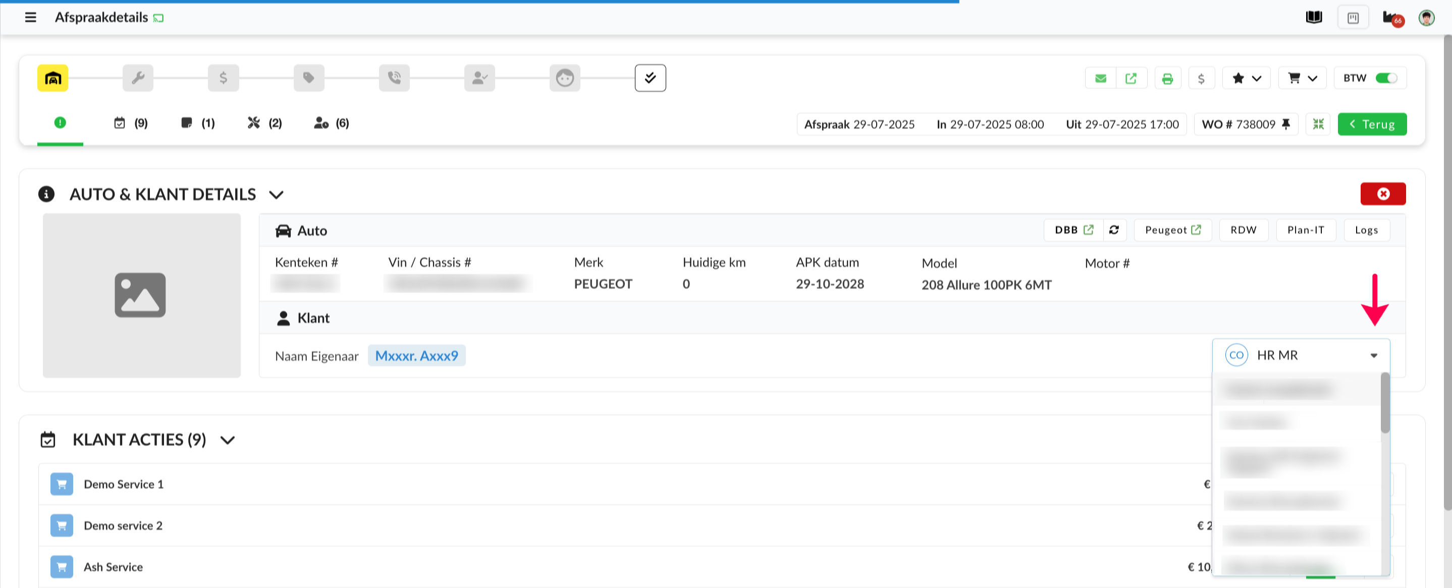 Als je de klant eigenaar van een specifieke WO wilt wijzigen, open je de afspraakdetailpagina en selecteer je een andere gebruiker.