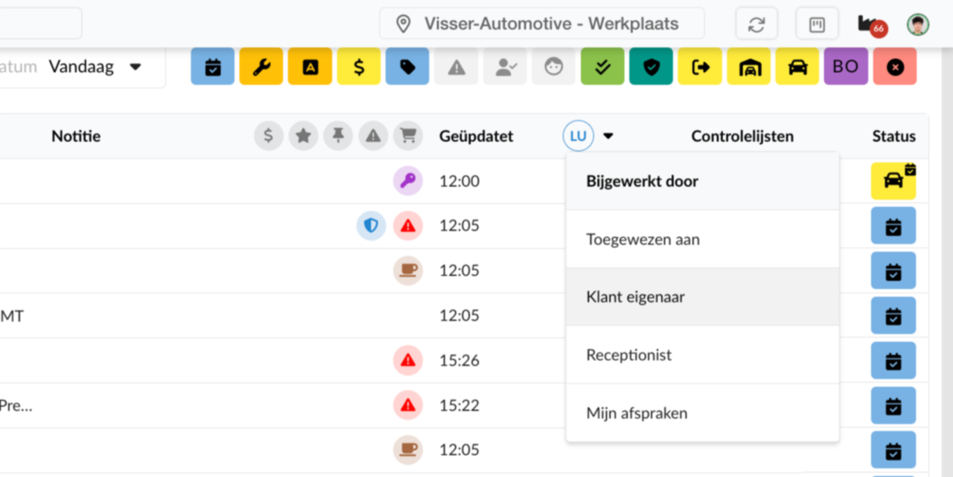 In de afsprakenlijst kun je in de kolomdropdown Klant eigenaar selecteren: